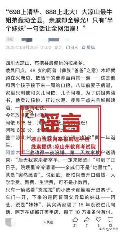 8月25日,一条标题为“698上清华、688上北大!大凉山最牛姐弟轰动全县,亲戚却全躲光!只有‘半个妹妹’一句话让全网泪崩!”的文章,引发不少网友关注。